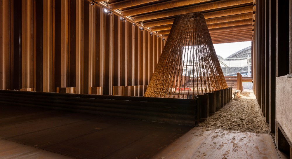 Diseñado por V8 Architects, con una experiencia para el visitante comisariada por Kossmanndejong, el pabellón crea una narrativa multisensorial en torno a los fenómenos naturales. Materiales industriales como láminas de metal, tubos de acero, conductos y tuberías se mezclan inesperadamente con la vegetación y los tejidos para crear un viaje espacial que culmina en una pieza central que proporciona una parada tranquila en medio del bullicio de la Expo.