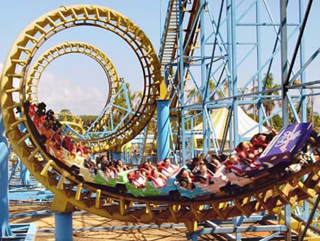 En principio íbamos todos juntos. Rápidamente se desprendió el primer grupo. Nos vamos a la montaña rusa, gritó uno de ellos. Por mi parte, hacía un buen rato que tenía un zumbido en mis oídos, eran ellos que trataban de convencerme. Me susurraban detalles de la misma. Uno de cada lado. Esta bendita (Látigo de fuego) desarrolla 100 km de velocidad, con cinco Loopings, a 40 metros de altura. Es un verdadero desafío. Vení, Raúl, no seas miedoso, me decían mis compañeros de aventuras. Me derretía de las ganas de ir. Los muy atrevidos me agarraban de las manos e intentaban arrastrarme. Me había comprometido a hacer una recorrida tranqui y no podía faltar a mi palabra. Lamentablemente, me tuve que jurar a mí mismo volver y así pegarle una sacudida a las atracciones más violentas.