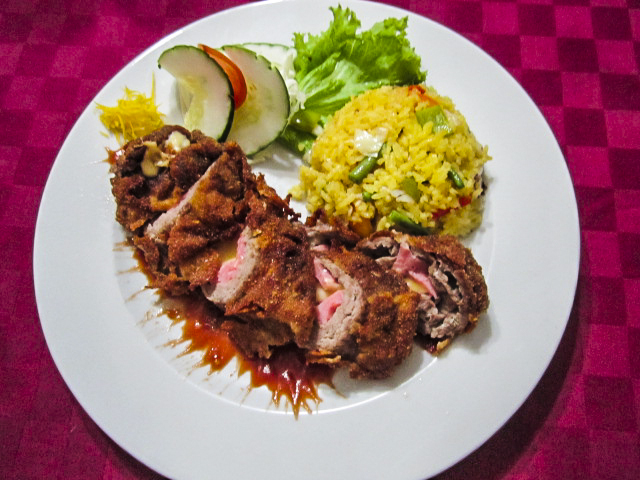 Salpimentar el bistec de cerdo, sazonar con ajo y vinagre. Luego se coloca el jamón y el queso en el bistec de cerdo para enrollarlo y pasarlo por harina, el huevo batido y por último, por pan rallado.