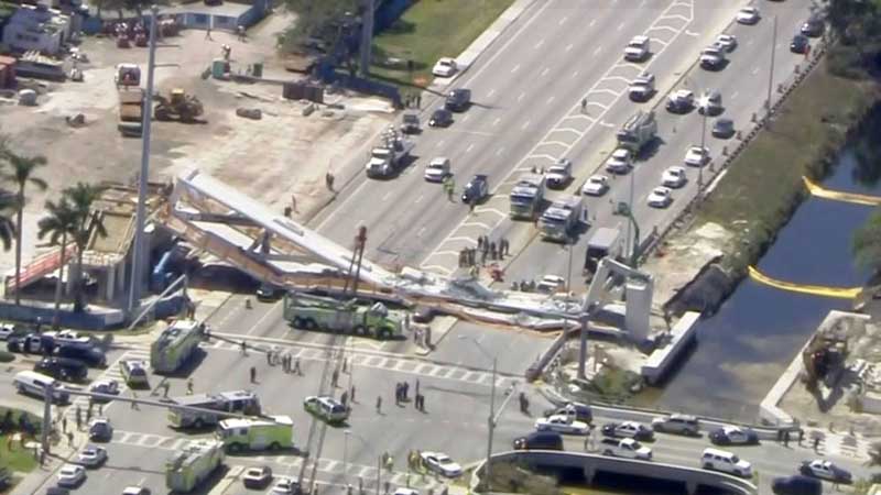 El puente, todavía en construcción, se desplomó por causas desconocidas sobre la calle Ocho a la altura de la avenida 109, y cayó sobre ocho carriles de la transitada Tamiami Trail —una autovía de más de 400 kilómetros que une las ciudades de Miami y Tampa—, aplastando ocho vehículos.