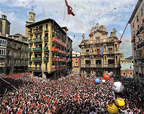 Con el disparo del “chupinazo” del día 6 se disparan también el bullicio y la alegría que no se detendrán hasta el “pobre de mí” del día 14. El “chupinazo” es un acto que tiene lugar en la plaza consistorial desde el año 1941: el cohete anunciador de las fiestas parte desde el balcón central del Ayuntamiento y, cuando estalla en el cielo pamplonés, la ciudad entera se transforma. Una explosión de vida funde a visitantes y pamploneses.