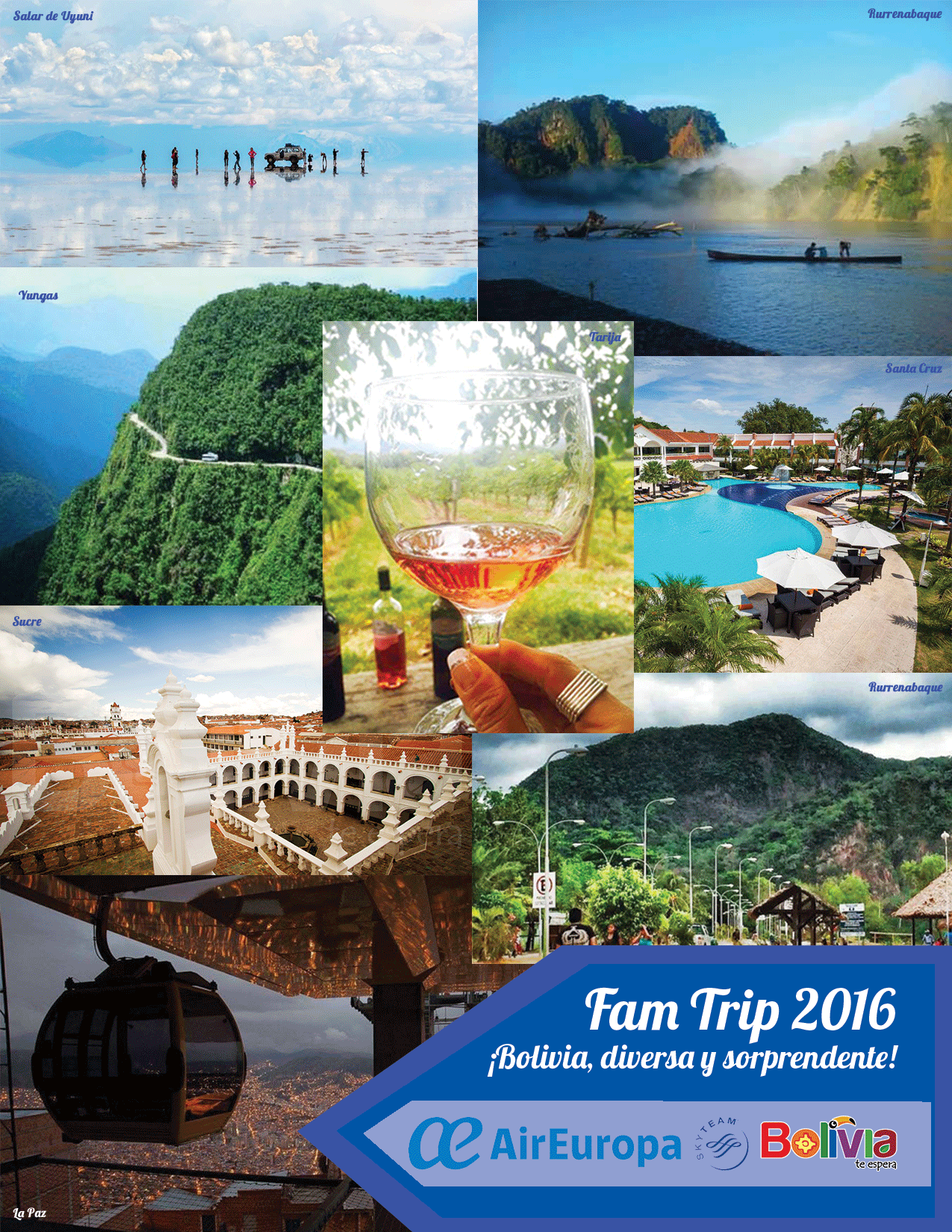 El Estado boliviano lleva adelante la nueva versión del "Fam Trip 2016: Air Europa - Bolivia te espera" en alianza con la aerolínea Air Europa, en coordinación con el sector privado del país Cámara Nacional de Operadoras de Turismo (Canotur), gobernaciones y municipios.
