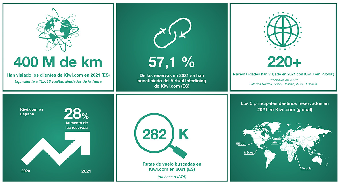 Las búsquedas de los viajeros españoles en la web de Kiwi.com en 2021 superan los 900 millones —un crecimiento del 18,5 % en comparación con 2020—, siendo Madrid, Barcelona, París, Palma de Mallorca, Londres y Ámsterdam los destinos más buscados. En base a la IATA, se calcula que se han buscado más de 280.000 rutas de vuelo desde España en Kiwi.com.
