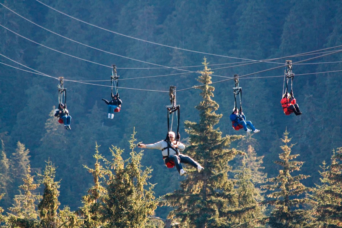 Haga el viaje en la tirolesa más larga del mundo (dependiendo de a quién le pregunte) sobre la exuberante selva tropical siempreverde cerca de Hoonah, Alaska, recorriendo más de una milla y superando las 60 millas por hora antes de aterrizar suavemente en una playa del lado del puerto.