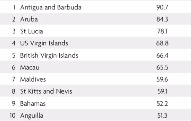En el listado que aparece a continuación, aparecen los países y el porciento de la fuerza laboral dedicada al sector turístico. Ocho de las diez naciones con mayor dependencia de la industria sin chimeneas pertenecen al Caribe.