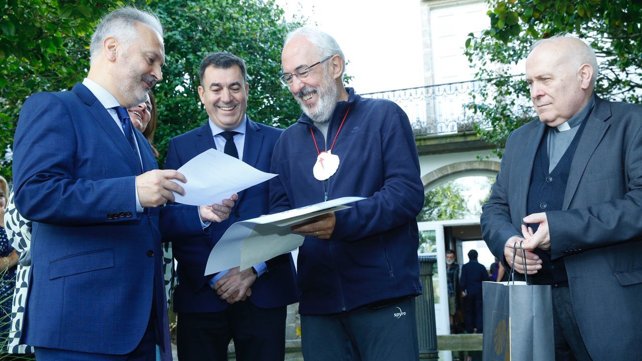 Este peregrino llegó este 1 de octubre a la oficina compostelana sobre las nueve de la mañana. Lo hizo mentalizado de que tendría que hacer cola para recoger su credencial. Y fue todo lo contrario, ya que tuvo un recibimiento especial que en un primer momento le provocó cierto susto porque ni por asomo se imaginaba que, además de su mujer, en Santiago le aguardaba un recibimiento institucional.